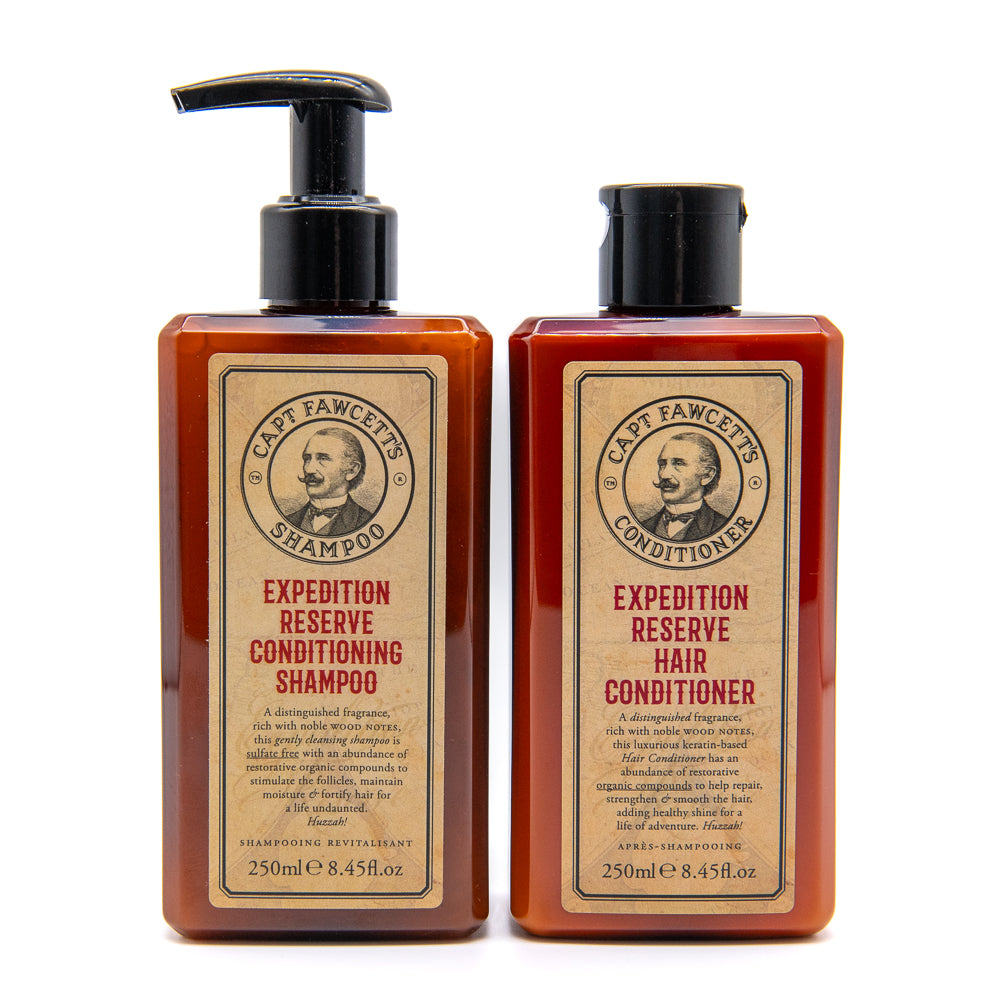Presenting Captain Fawcett’s 'Expedition Reserve' Shampoo and Hair Conditioner handsomely paired in a simply splendid Gift Set to provide a complete ‘Hair Couture’ routine for the contemporary gentleman adventurer.